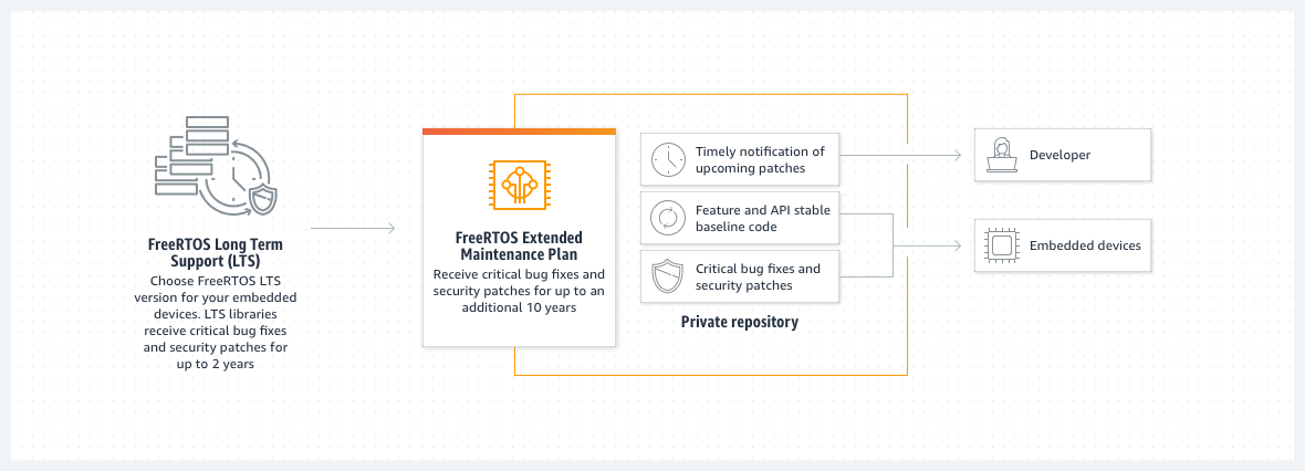 FreeRTOS 延长维护计划 (EMP) 能够让您从初始 LTS 周期到期后长达 10 年里 在您所选 FreeRTOS Long Term Support (LTS) 版本上接收安全补丁和关键故障修复[^1] 。FreeRTOS EMP 由 Amazon Web Services (AWS) 提供,可帮助客户 在数年内保护其基于微控制器的设备,节省操作系统升级成本, 同时降低与设备现场修补相关的风险。
